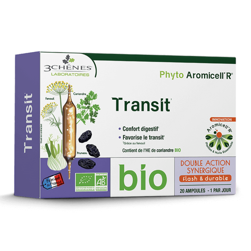 NB: LA DATE DE PEREMPTION EST 05/2026 Phyto Aromicell'R Transit est un complément alimentaire qui soutient le confort digestif et le transit. Proposé par la marque Les 3 Chênes, il se présente sous forme d'ampoules.