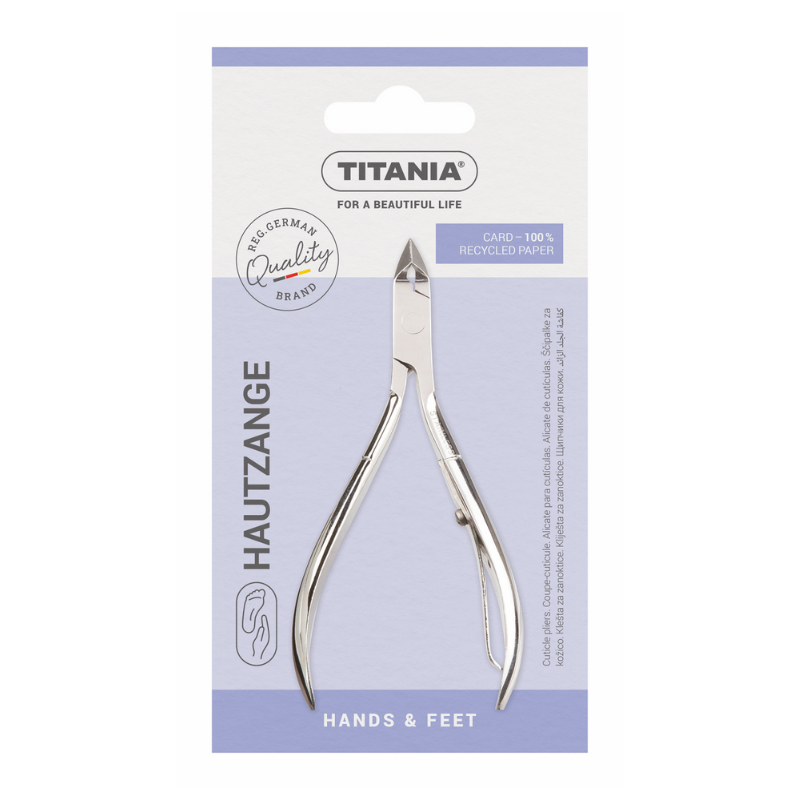 La pince à cuticules Titania (modèle 1059) est un outil de manucure et de pédicure essentiel conçu pour éliminer avec précision l'excès de cuticules et d'ongles incarnés, favorisant des ongles plus sains et soignés.