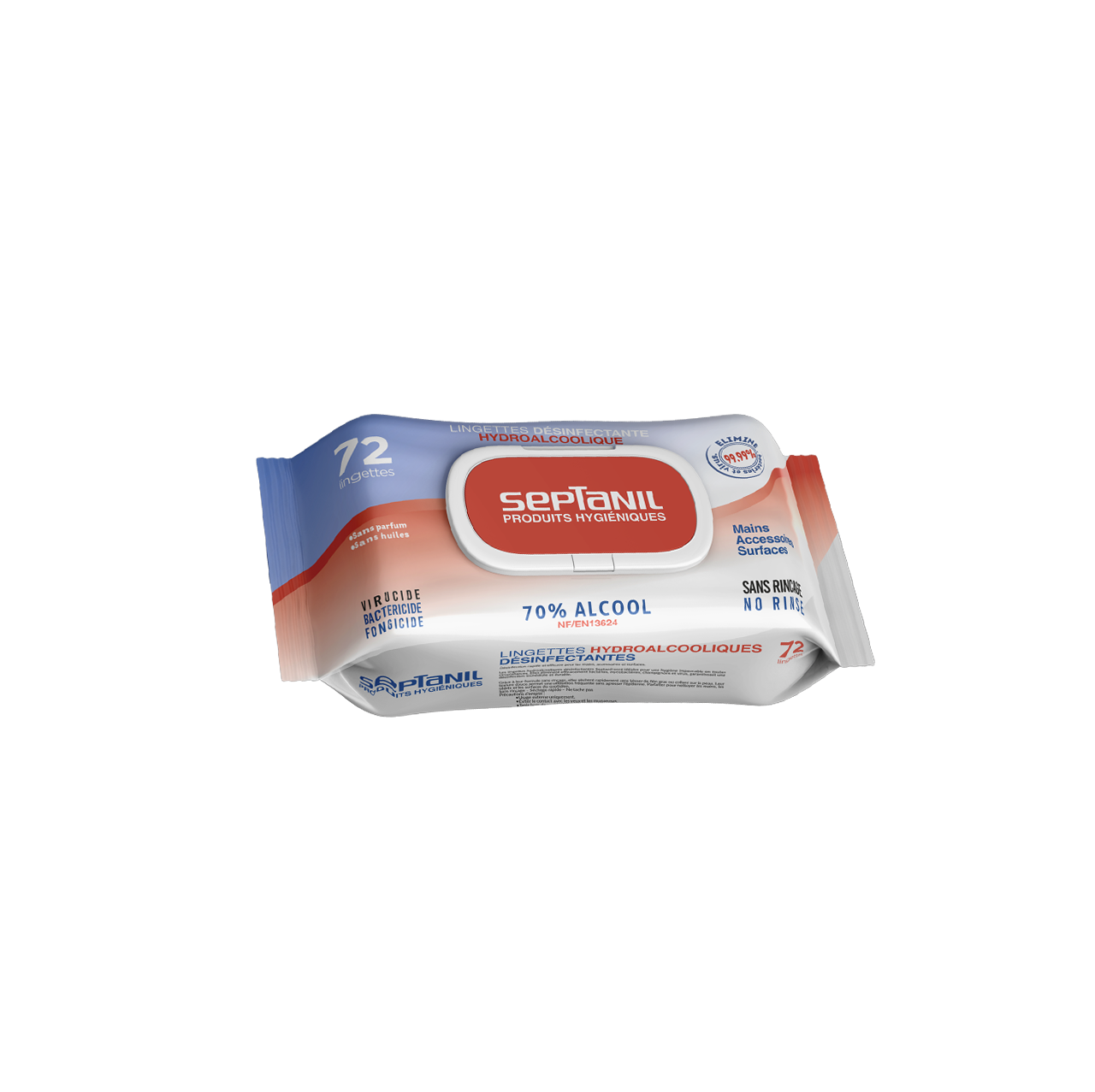SEPTANIL LINGETTES DESINFECTANTES SOLUTION HYDROALCOOLIQUE 70% ALCOOL 72 LINGETTES