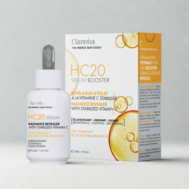 Clarenia HC 20 sérum Booster est un produit de soin de la peau qui combine les avantages de la vitamine C et de l'acide hyaluronique pour offrir une hydratation intense et améliorer l'apparence de la peau. La vitamine C est un antioxydant puissant qui aide à protéger la peau des