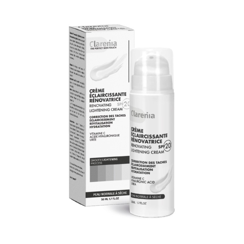 La crème éclaircissante rénovatrice peau normale a sèche de la marque Clarenia™ permet de corriger les tâches et prévenir leur répartition, d'hydrater la peau en surface et en profondeur, réduire les effets néfastes des UV grâce à une protection solaire SPF 20 et augmenter les bénéfices des traitements dépigmentants.