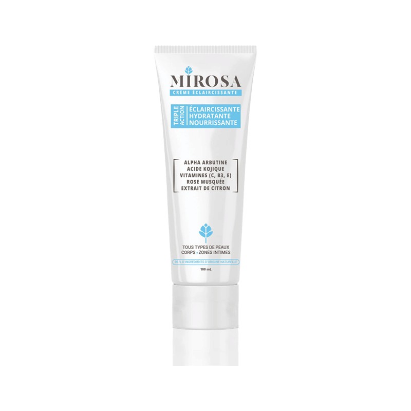 La Crème éclaircissante MIROSA est conçue spécialement pour : Éliminer les taches brunes et limiter leur réapparition. Unifier la couleur du teint. Corriger les pigmentations de la peau en lui donnant un aspect unifié.