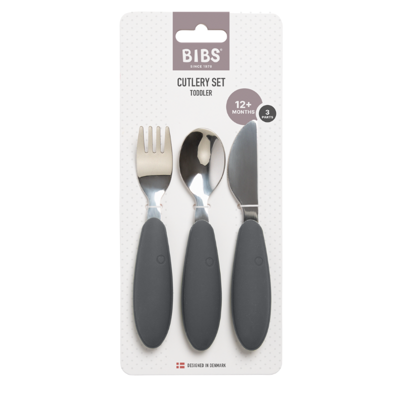 BIBS Set de Couverts Iron 12M+ avec cuillère, fourchette et couteau. Idéal pour l’apprentissage de l’alimentation autonome des tout-petits, sûr et durable.