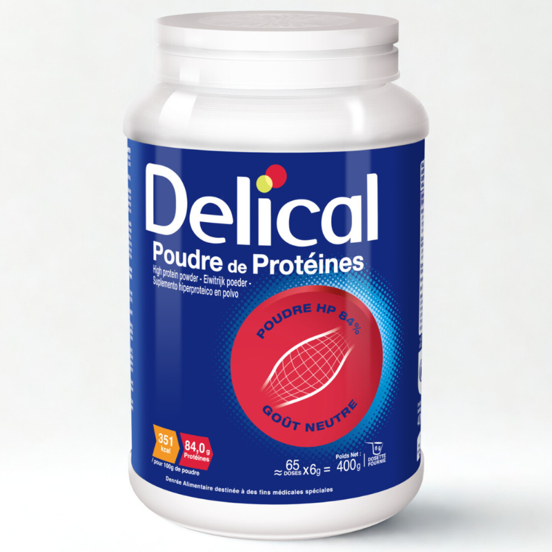Delical Poudre De Protéines Goût Neutre 400g est une denrée alimentaire destinée à des fins médicales spéciales, destinée à l’enrichissement de l’alimentation des adultes et des enfants à partir de 3 ans.