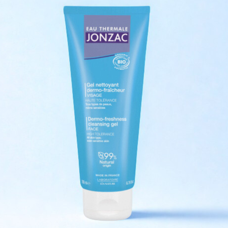 Le Gel Nettoyant Dermo--Fraîcheur Eau Thermale Jonzac est un soin visage qui démaquille et élimine les impuretés tout en préservant la barrière cutanée.