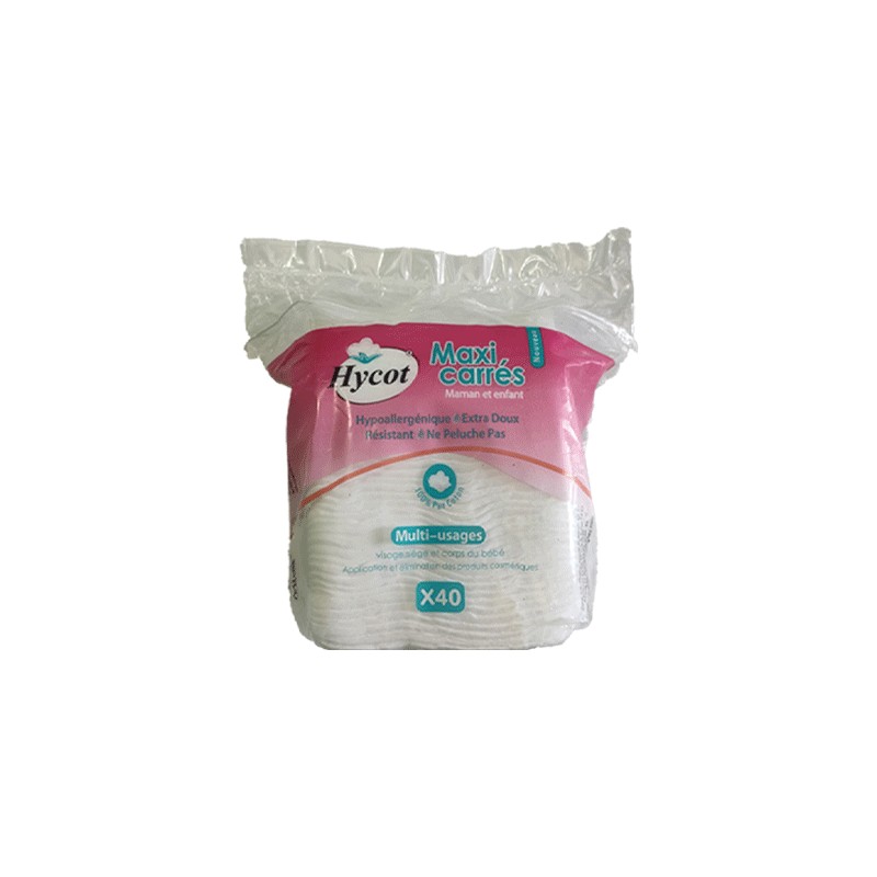 Hycot maxi carrés pour maman et enfant pour multi-usages. Utilisable pour visage, siège et corps bébé ainsi que l'application et l'élimination des produits cosmétiques