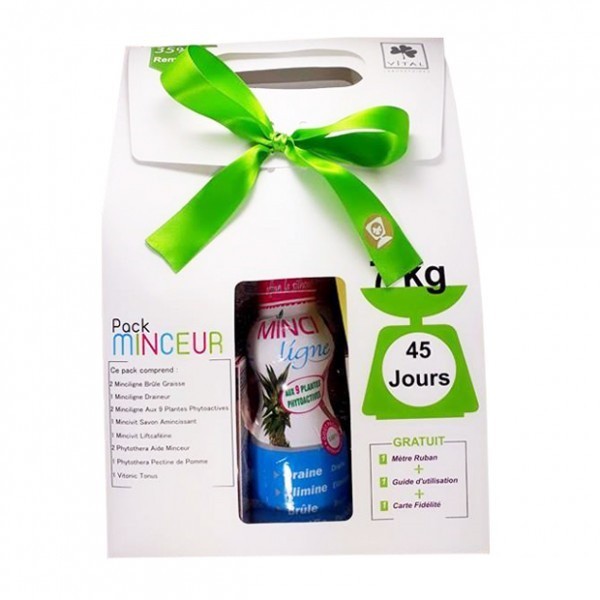 Le Pack Minceur - Perdre 10 Kg en 60 Jours de Vital est un pack composé de 17 soins complémentaires : MINCILIGNE DRAINEUR MINCILIGNE BRULE GRAISSE MINCILIGNE AUX 9 PLANTES PHYTOACTIVES MINCILINGE COUPE FAIM PHYTOTHERA PECTIE DE POMME MINCIVIT LIFTCAFEINE VITONIC TONUS + PHYTODIGEST