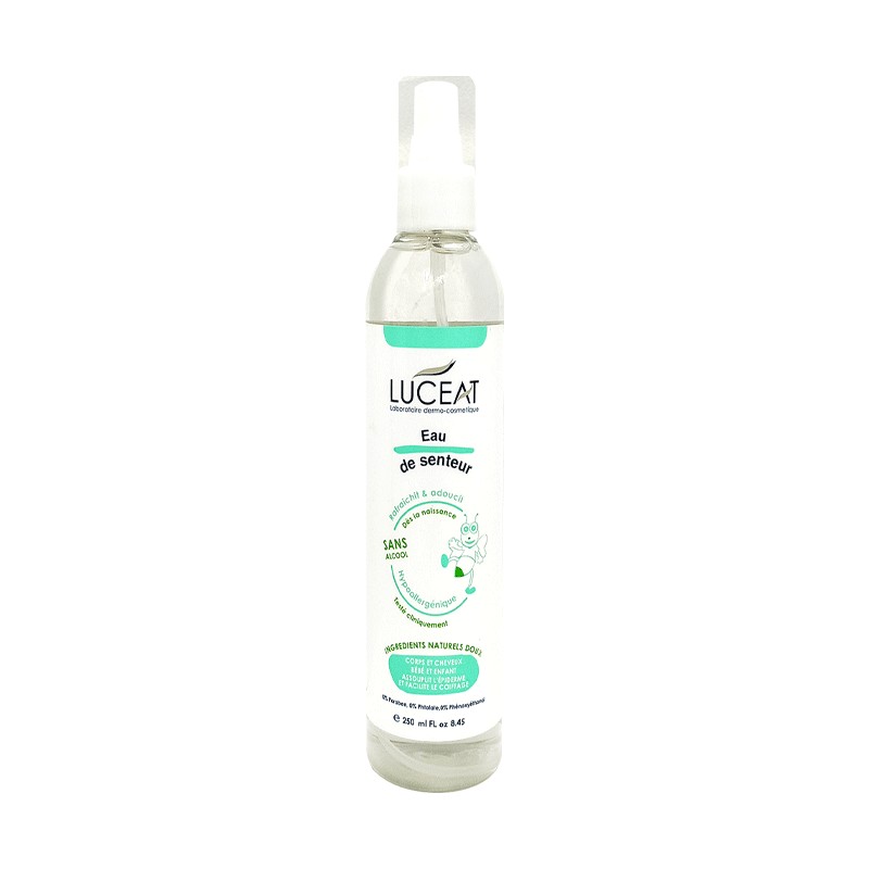 Luceat Eau de senteur formule hypoallergénique et sans alcool et son pH physiologique préservent l'équilibre naturel du cuir chevelu et del'épiderme.
