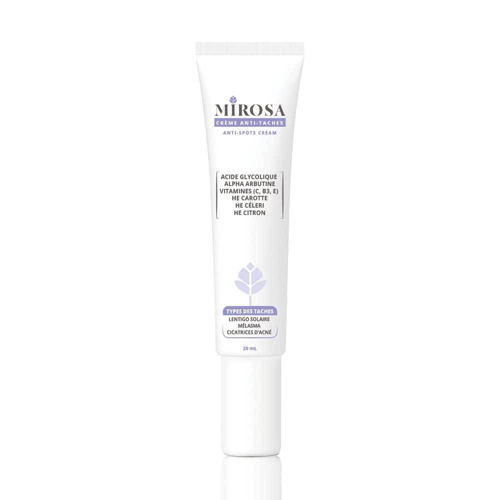 Crème Anti-taches Mirosa est Conseillée pour lutter contre les taches brunes liées au vieillissement cutané ou à la grossesse. Grâce à sa formule riche en huiles essentielles, actifs et vitamines.