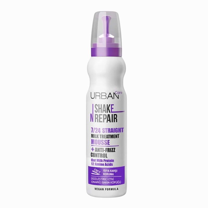 La mousse lissante URBAN Care Shake N Repair 7/24 cible les cheveux difficiles à coiffer et frisés grâce à sa formule spécialement développée pour créer des coiffures parfaitement lisses et durables. Grâce aux protéines de lait d'avoine qu'il contient et aux vitamines et minéraux qu'il renferme, il aide à réparer